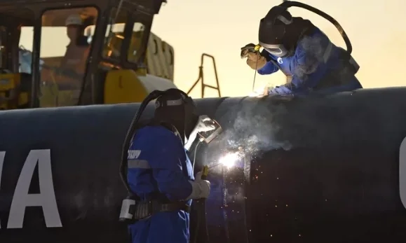 “西伯利亚力量”天然气管道首段连接仪式上,工人正在焊接接缝 俄新社
