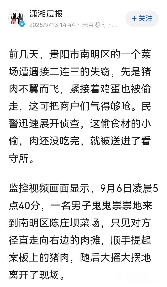 » 囊中羞涩,贵阳一大叔因嘴馋凌晨到菜场偷肉,被抓时红烧肉还在冒热气