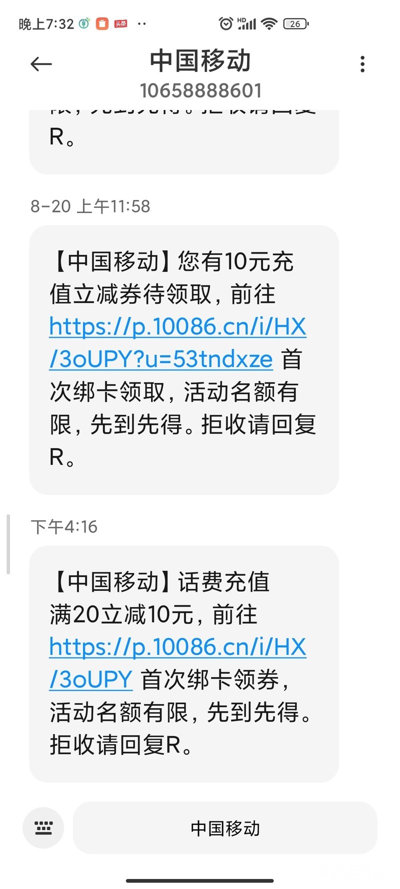 今天移动发了个短信说充20减10,以前就发过了,没高兴理会,这次心想领就领下吧。