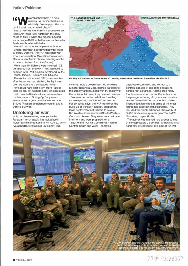 该刊资深编辑艾伦·沃恩斯亲赴巴基斯坦,不仅采访了参与空战的巴空军飞行员,更实地考察了其作战体系,从而获取了关于这场空战的一手资料。从其预先披露的信息来看,此次空战的结果可能比此前传闻的更为震撼。印度空军损失的阵风战斗机不是三架,而是四架,且巴方取得的战果远不止于击落敌机,更关键的是,把印军在战场上的信息传递链条给全方位压制并彻底破坏掉了。