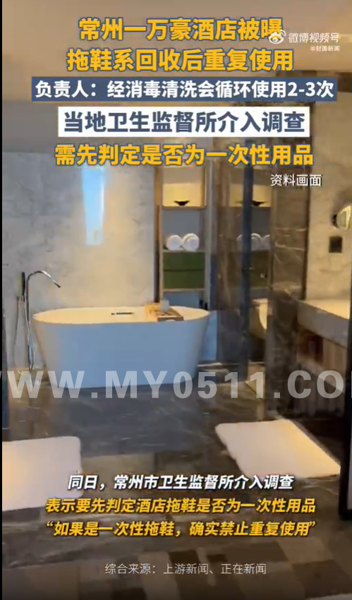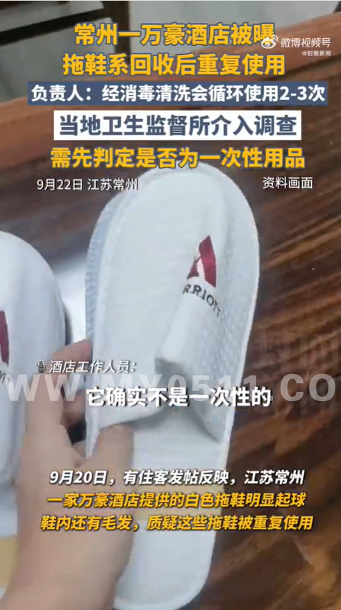 9月20日,有网友发帖反映,江苏常州一家万豪酒店提供的白色拖鞋明显起球,鞋内还有毛发,质疑这些拖鞋被重复使用。21日,记者采访涉事酒店相关负责人承认,出于环保考量,该酒店拖鞋经消毒清洗后会循环使用2-3次。同日,常州市卫生监督所介入调查,表示要先判定酒店拖鞋是否为一次性用品。“如果是一次性拖鞋,确实禁止重复使用。”(上游新闻)