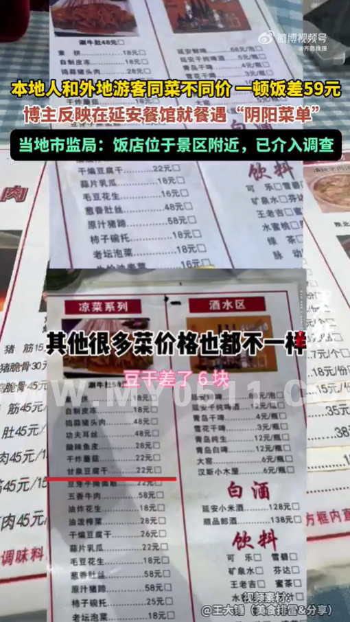 饭店疑用阴阳菜单一顿饭差59元