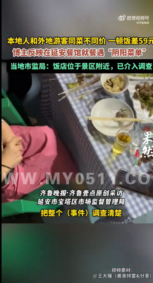 9月27日,有博主发布视频爆料称,在陕西省延安市宝塔区红街某饭店遭遇“阴阳菜单”,本地人与外地游客一顿饭总价相差59元。视频中,面对质疑,饭店方面解释,老顾客可享受折扣。27日上午,齐鲁晚报·齐鲁壹点致电宝塔区市场监督管理局,相关工作人员回应,该饭店位于景区周边,目前已联合文旅局等部门介入调查,后续将对外通报结果。截至发稿前,记者多次联系涉事饭店,电话未能接通。(齐鲁晚报)