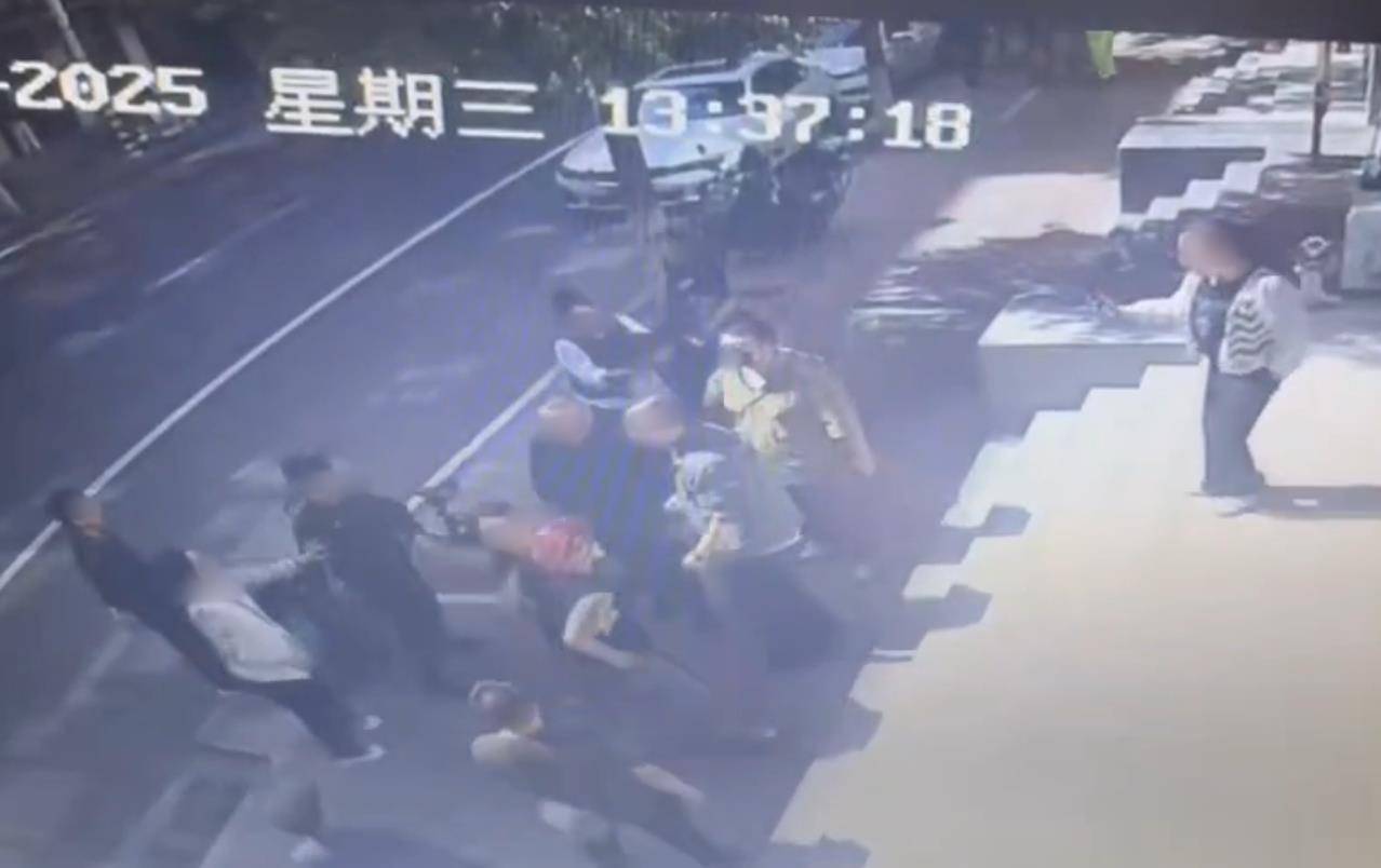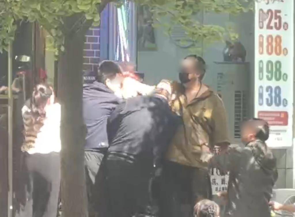 视频显示,在理发店门口,多名身穿城管制服的人员将一名红发男子推到墙角,一旁的女子疑似在劝架。此时,另一名穿城管制服的人员走过来,双方发生肢体冲突。双方拉扯时,一名戴口罩的黄衣男子拽住红发男子的头发并拉扯。推搡中,红发男子重心不稳倒地。混乱中,红发男子反复踹脚。穿制服的人员散开后,红发男子蹲在地上,一名穿制服的人员手捂额头。随后,红发男子突然拿起一块砖头,疑似被旁人夺下。双方在路边又发生冲突,周围的人劝架才将他们拉开。