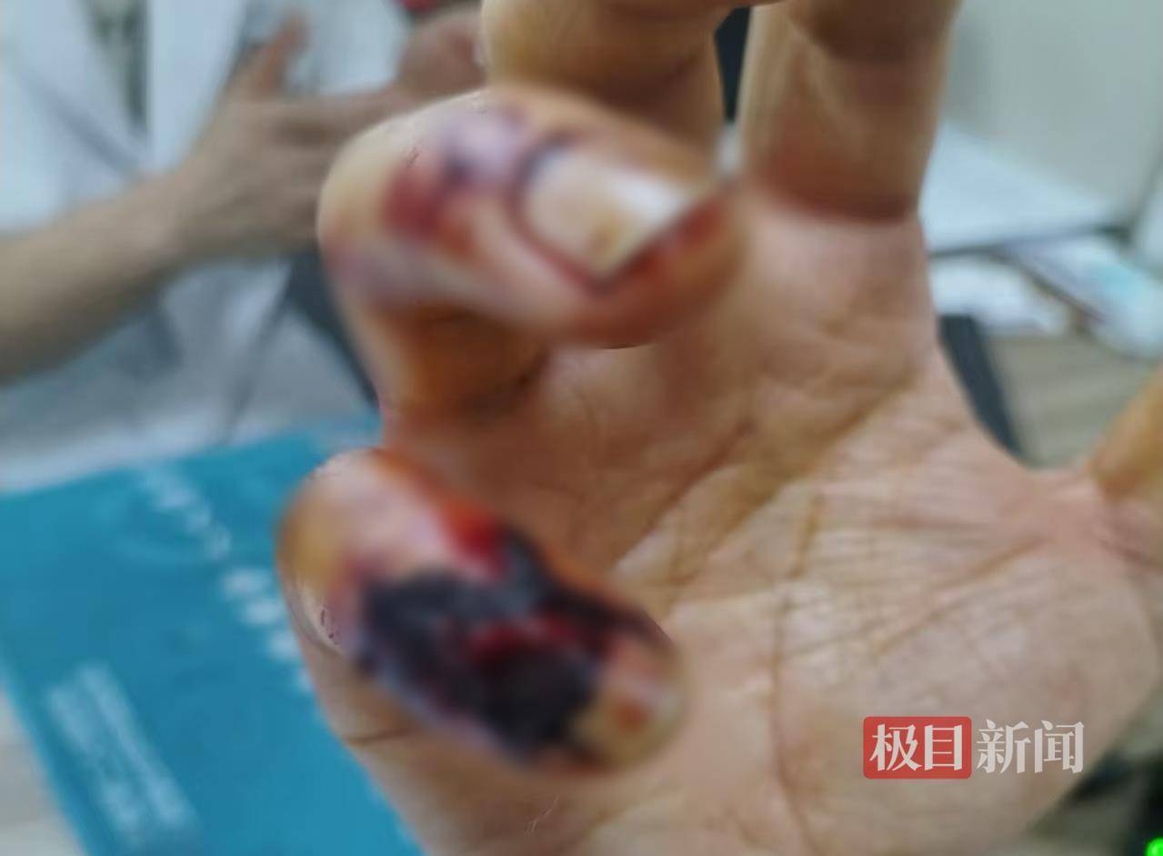 张先生表示,双方发生冲突时,他被一名身材较胖的执法人员咬住了手指。门诊病历显示,张先生被诊断为开放性手部损伤,“我的手指被咬破,指甲也断了,当时血流不止。”