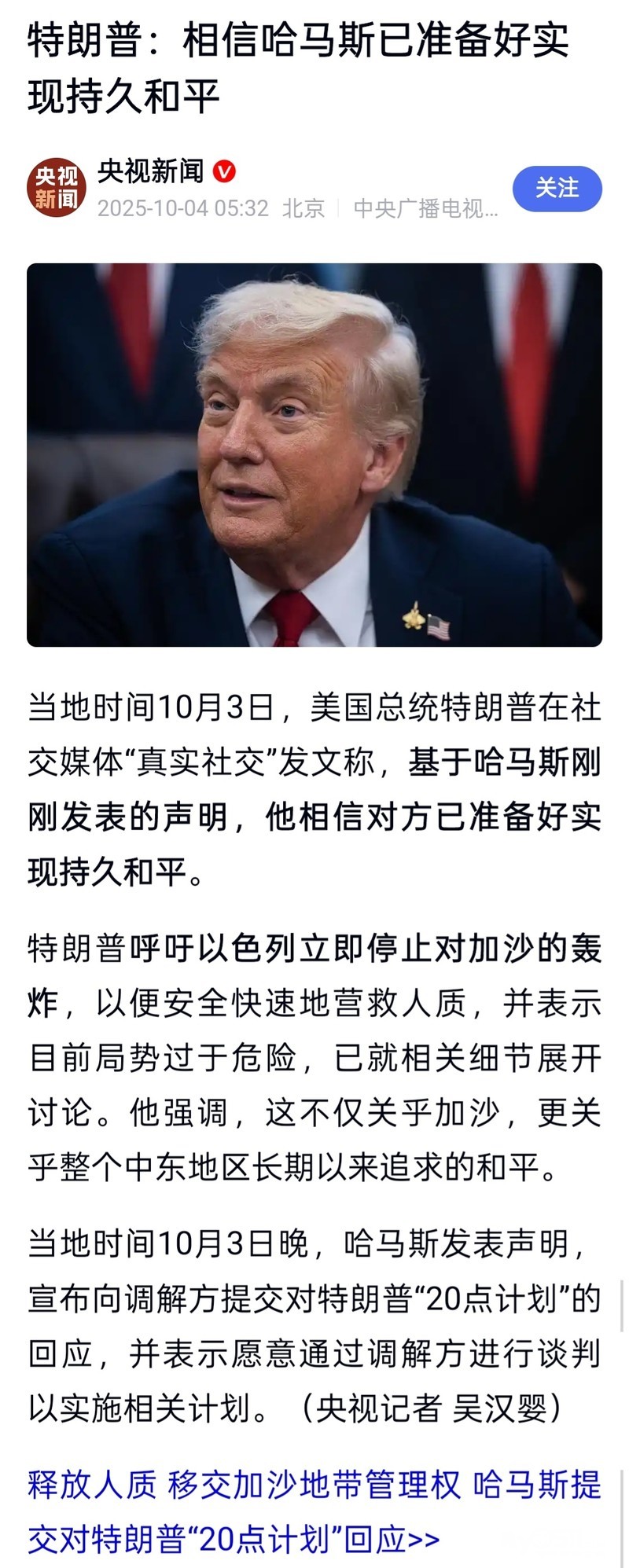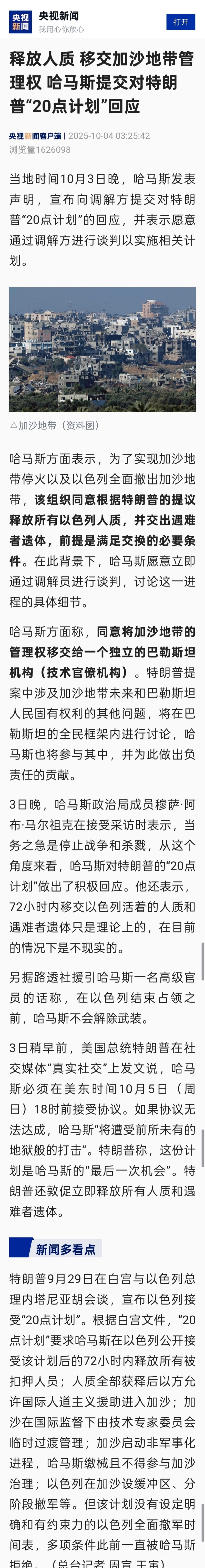 释放人质 移交加沙地带管理权 哈马斯提交对特朗普“20点计划”回应