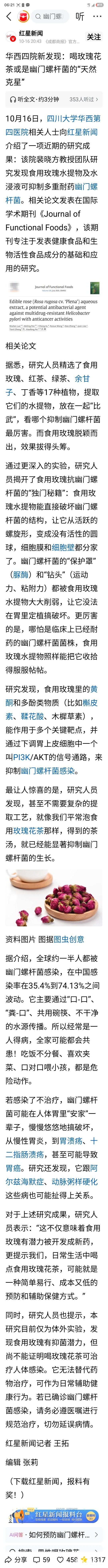 喝玫瑰花茶或是幽门螺杆菌的“天然克星”