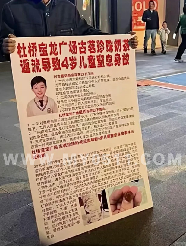 近日,台州杜桥宝龙广场一场悲剧刺痛人心——4岁幼童因饮用古茗珍珠奶茶后窒息,经抢救无效离世。 涉事奶茶店被指未对大颗粒珍珠进行粒粒分离,直接将成团珍珠倒入奶茶;店内也无明显“幼儿不宜食用大颗粒饮品”警示,工作人员更未口头提醒。与此同时,杜桥宝龙广场游乐场所管理也遭质疑:在“不许带食物进入游乐设施”的规定下,工作人员未阻止珍珠奶茶带入;面对突发意外,商场人员无应急处置方案、未及时救援,甚至有家属称求助时被告知“不会救助、不懂急救”。 一颗珍珠,三条追问:古茗的饮品安全管控何在?宝龙广场的场所责任何存?幼童的生命代价,能否换来消费场景与公共场所对儿童安全的真正重视?目前事件仍在发酵,各方责任亟待厘清,愿这样的悲剧不再重演。