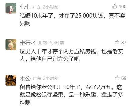 徐女士称:“那天刚好我老公酒喝多了,我不知道他从哪里拿出来一沓现金,然后他就自己说,藏了多少私房钱,就一直在那里数。我和他结婚十多年了,之前都不知道他存了私房钱,大概一共有25000多元吧,我想再观察两天,看看他有没有发现私房钱不见了,那既然大家都已经知道了,那肯定要给她‘上缴’了。”