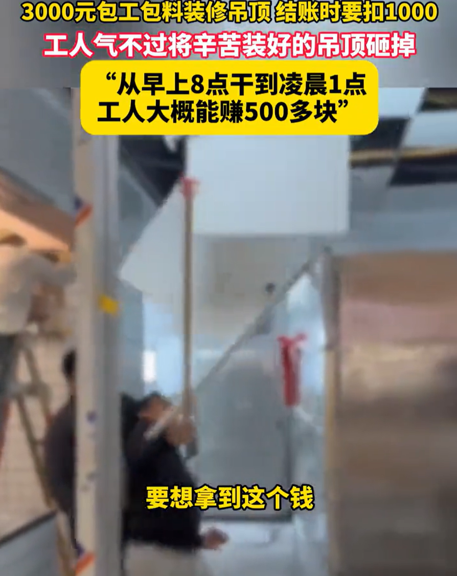 3000元的活,干17个小时后被雇主扣1000元,工人怒拆吊顶