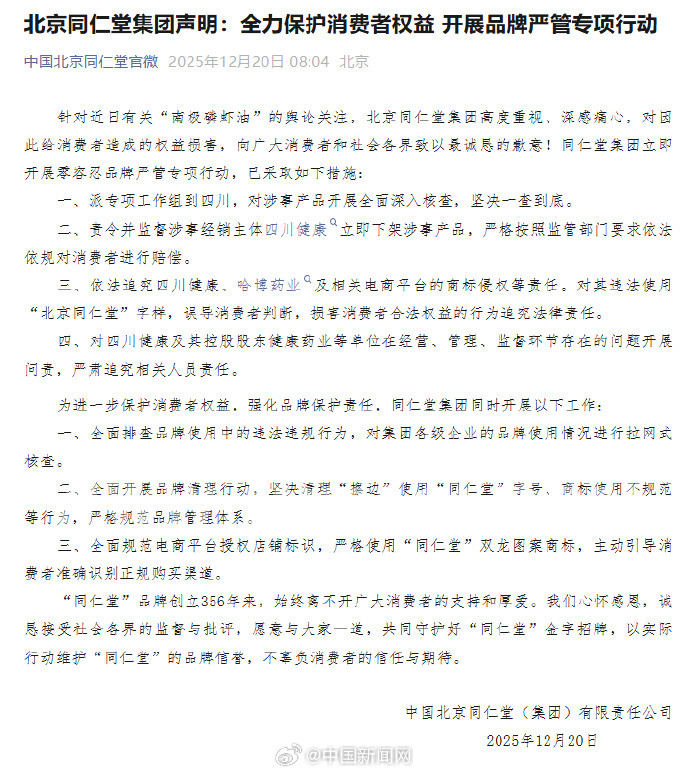 中国北京同仁堂(集团)有限责任公司20日发布声明:针对近日有关“南极磷虾油”的舆论关注,北京同仁堂集团高度重视、深感痛心,对因此给消费者造成的权益损害,向广大消费者和社会各界致以最诚恳的歉意,同仁堂集团立即开展零容忍品牌严管专项行动。
