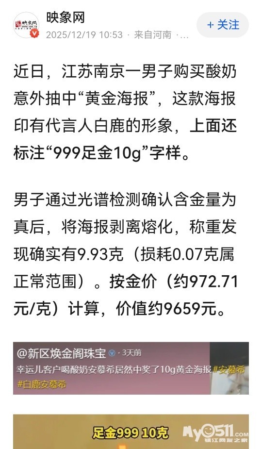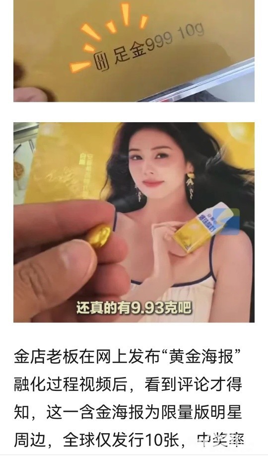 » 江苏一男子意外抽中“白鹿足金黄金海报”,熔出近10g金豆