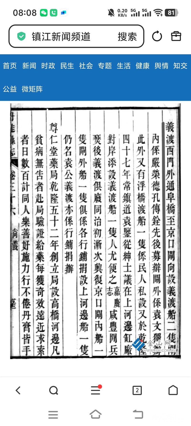 《大运河文化与镇江》第十五课:城西古运河上的义渡。古运河自西门桥至大京口,有常镇道袁鉴建的袁公义渡,以及袁文,严荣德,孔传铨建立的计3处义渡。袁鉴建的"袁公义渡",《嘉庆丹徒县志》卷二十六"义举"记载:"乾隆四十七年(1782),常镇道袁鉴从绅士议,于上河边缸厂对岸添设义渡船一只,人尤便之。"是说乾隆四十七年,袁鉴身为常镇道,在缸厂对岸添置渡船一只,老百姓感激敬重袁鉴,称此曰"袁公义渡".