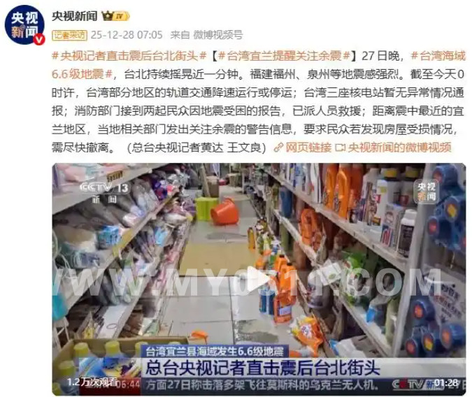 据@央视新闻消息,27日晚,台湾海域6.6级地震,台北持续摇晃近一分钟。福建福州、泉州等地震感强烈。截至今天0时许,台湾部分地区的轨道交通降速运行或停运;台湾三座核电站暂无异常情况通报;消防部门接到两起民众因地震受困的报告,已派人员救援;距离震中最近的宜兰地区,当地相关部门发出关注余震的警告信息,要求民众若发现房屋受损情况,需尽快撤离。(总台央视记者黄达 王文良)