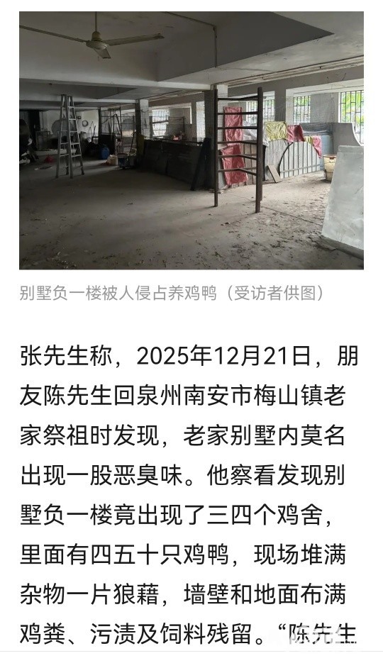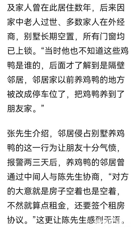 » 花500万建的别墅被邻居侵占养鸡鸭,邻居表示可以交租金,警方介入处理