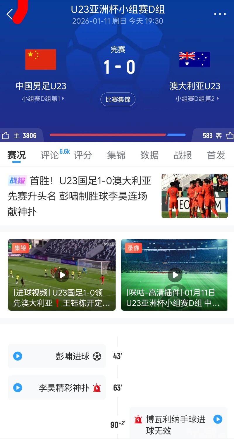 » U23男足亚洲杯,中国1:0澳大利亚