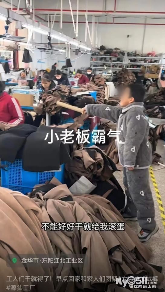 近日,浙江金华东阳的一家女装小厂的视频被网友疯传。视频中,一个十来岁的男孩穿着厚厚的睡衣,在车间里踮着脚,一手拎着木棍,一边对着一群女工吆五喝六。他的语气不容置疑,甚至带着命令式的口吻:“干不好就滚!”
