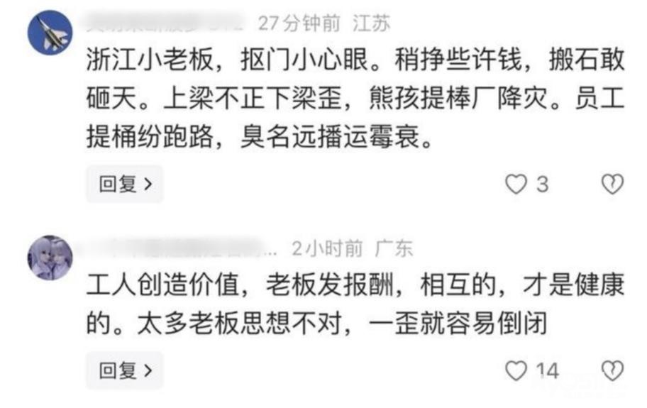有网友说得直白:“你以为你是老板,其实你只是先挣了点钱的普通人。没了工人,你什么都不是。”