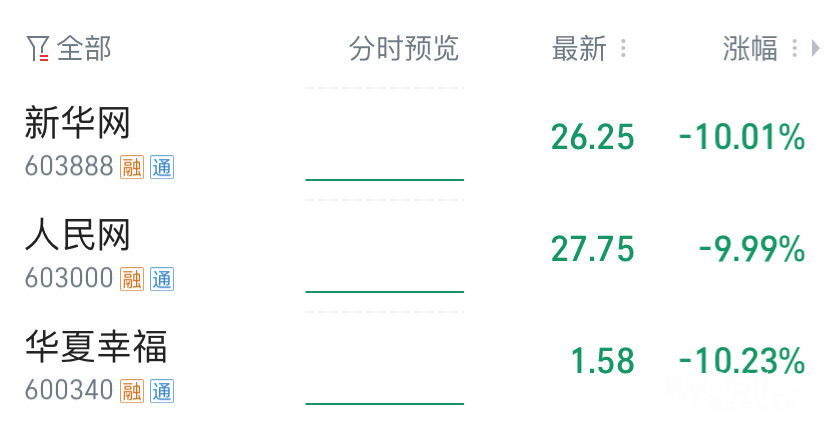 人民网快讯:新华网跌停。 新华网快讯:人民网跌停。