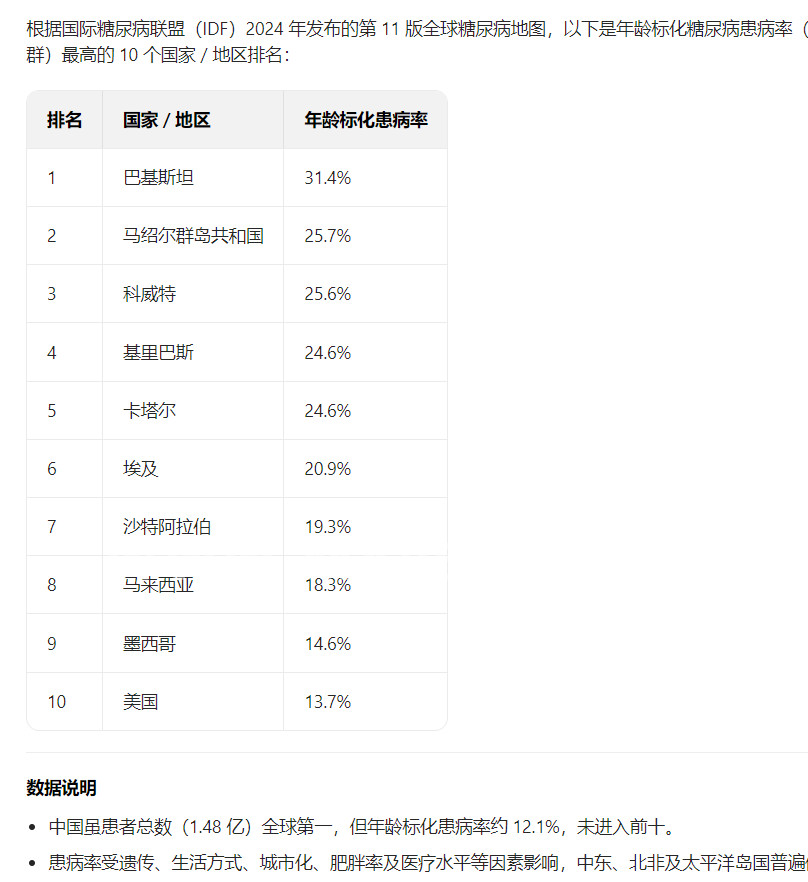 中国糖尿病发病率12.1%,远低于美国的13.7%的水平此外还有一些中东国家科威特,沙特 卡塔尔埃及大多数都在20%以上