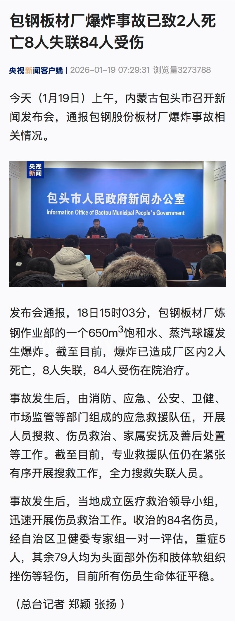 据央视新闻,1月19日,内蒙古包头市召开新闻发布会,通报包钢板材厂爆炸事故相关情况。爆炸事故造成厂区内2人死亡,8人失联,84人受伤在院治疗。消防、应急、公安、卫健、市场监管等部门组成应急救援队伍,开展人员搜救、伤员救治、家属安抚及善后处置等工作。截至目前,专业救援队伍仍在开展搜救工作,全力搜救失联人员。