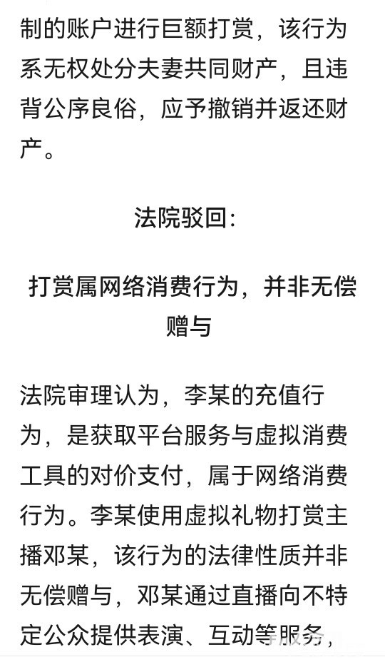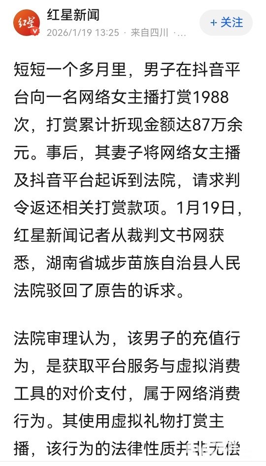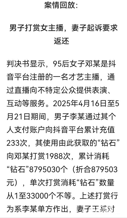 » 丈夫打赏女主播1988次,累计金额超87万,妻子起诉主播和平台要求返还被驳回