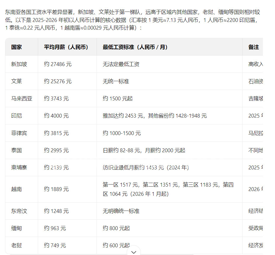 - 越南:平均月薪为 1730 万越南盾,约合 2492 元人民币。