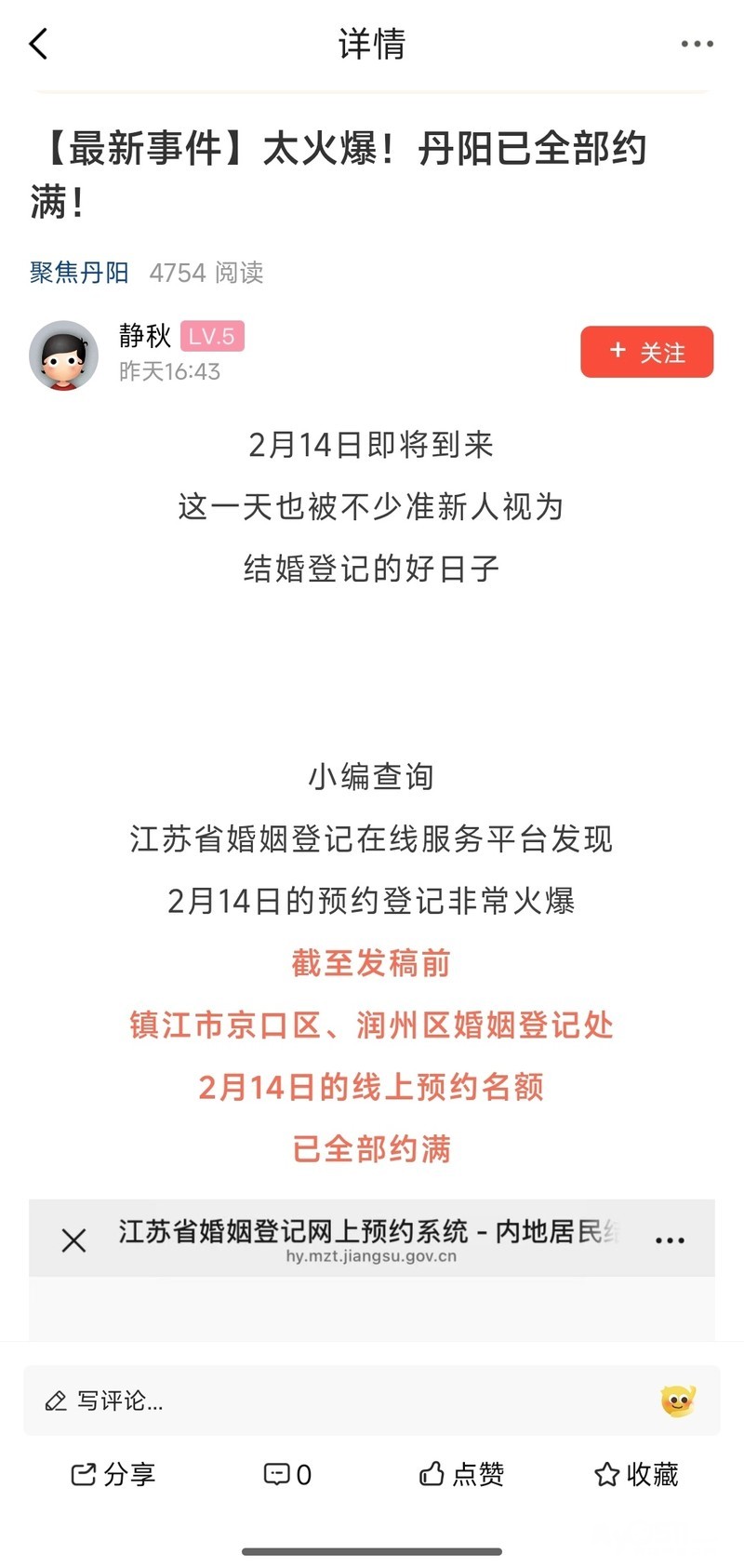 再看今年2月14日情人节镇江各区民政局预约登记结婚人数基本上爆满了,京口区、润州区、丹阳市结婚登记处线上预约名额已满了,丹徒、扬中、经开区、句容预约名额也不多了