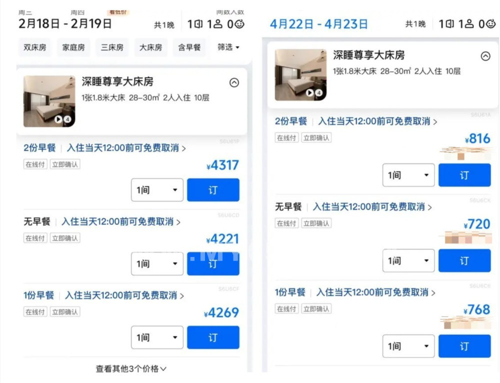 去年过年南下,大部分酒店都涨了10倍。比如某家,平常120-150,过年期间1200。