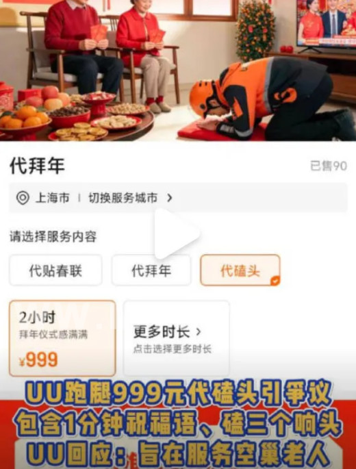 海报显示代拜长辈套餐包含代买年货、代送礼品、1分钟吉祥话祝福,磕三个响头,还可实时视频直播和其他定制服务。其中,代磕头行礼服务引发热议,随后,账号“无所不能的UU跑腿”在评论区回应:“代拜年磕头服务”旨在为那些因工作、出行等原因无法返乡过年,却仍想向家中长辈传递心意与祝福的人,提供一个暖心的情感联结方式。我们尤其关注空巢老人等需要陪伴的群体,希望借此服务,在节日里为他们送去一份真诚的问候与关怀。