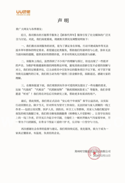 2月11日,平台运营主体,河南郑州时空隧道信息技术有限公司发布《关于代拜年服务的情况说明》表示,引发争议的服务项目予以下架。