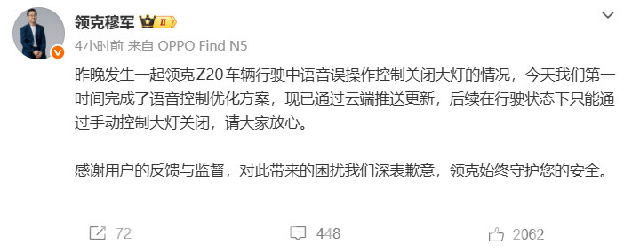 2月26日晚间,领克汽车销售有限公司副总经理穆军针对此事发文回应,明确了事故起因是领克Z20车辆行驶中出现的语音误操作问题。