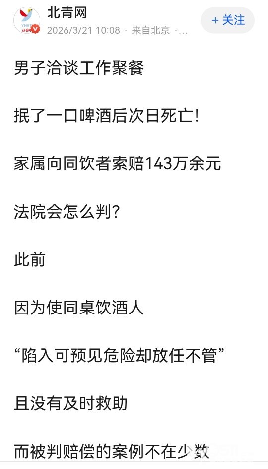» 自称高血压不宜饮酒!男子聚餐抿一口啤酒后死亡,家属索赔143万!法院判了