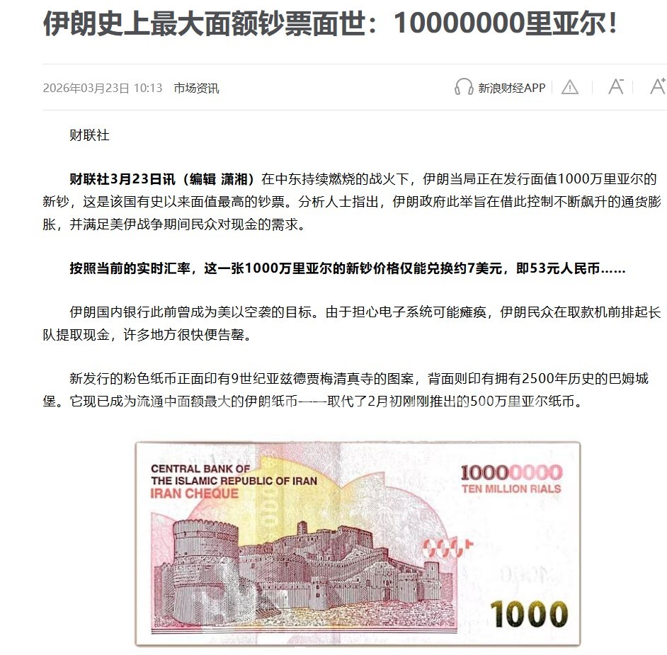 » 伊朗史上最大面额钞票发行:1000万里亚尔