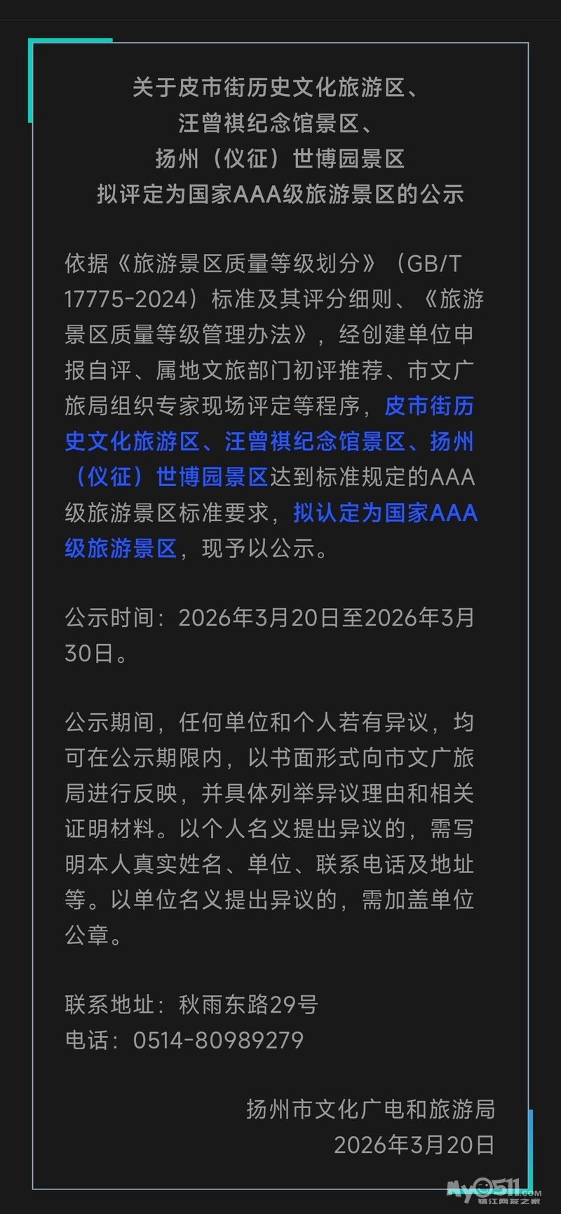 扬州新增三家“AAA”级景区,公示至3月底,存异可举!