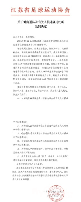 依据《中国足球协会纪律准则》相关条款,江苏省足协针对上述违规违纪行为作出处罚:南通队18号程鑫、20号张浩楠:在江苏省内正式足球赛事中各停赛8场;南通队5号薛天翼:在江苏省内正式足球赛事中停赛5场;南通队31号季桑楠:在江苏省内正式足球赛事中停赛3场;南通队予以通报批评,责令作出书面检查,对相关责任人进行严肃处理;责成南通队全体人员(队员、教练员、工作人员等)开展法规政策学习与常态化赛风赛纪教育。