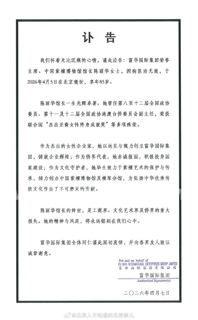富华国际集团4月7日发布讣告:富华国际集团荣誉主席、中国紫檀博物馆馆长陈丽华女士,因病医治无效,于2026年4月5日在北京逝世,享年85岁。
