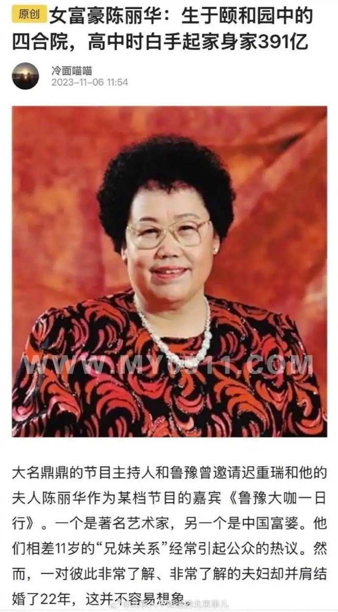 陈丽华与迟重瑞婚姻曾引发关注。环球人物报道,1990年,陈丽华与比她小11岁的“唐僧”迟重瑞结了婚。陈丽华是个票友,酷爱京剧,据说他们就是在一次京剧活动中相识,共同的爱好让他们走在了一起。