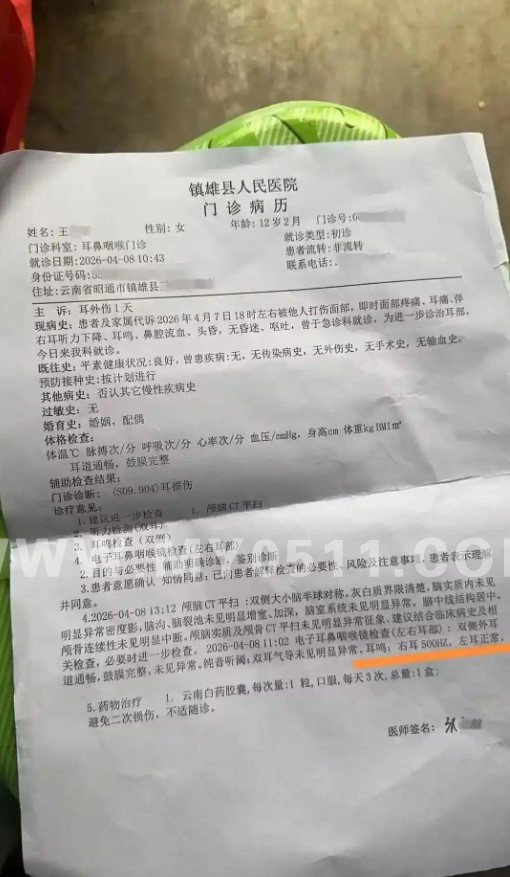4月10日,云南昭通镇雄县的王先生反映称,他女儿王童(化名)在当地一所名为“蓄菁学校”的私立学校读六年级。7日晚,因女儿给该校一老师起外号,被这名老师扇了四耳光,“当时就打流鼻血了,之后她说头晕耳鸣,第二天到医院检查,医生诊断为耳损伤。”