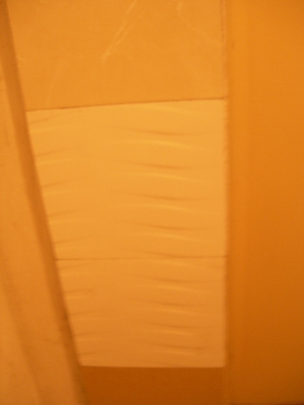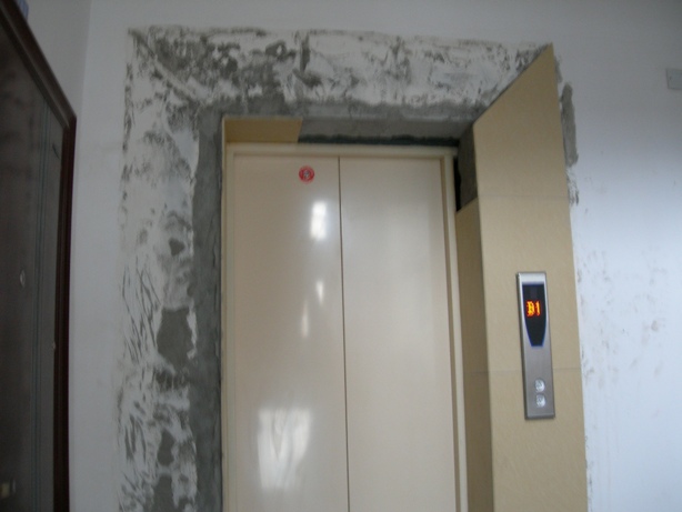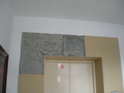 地下车库的电梯口的瓷砖也掉了,有一天看到几个工人在维修,心中一阵狂喜,终于有人来补掉的瓷砖了!没想到补成了这样!!