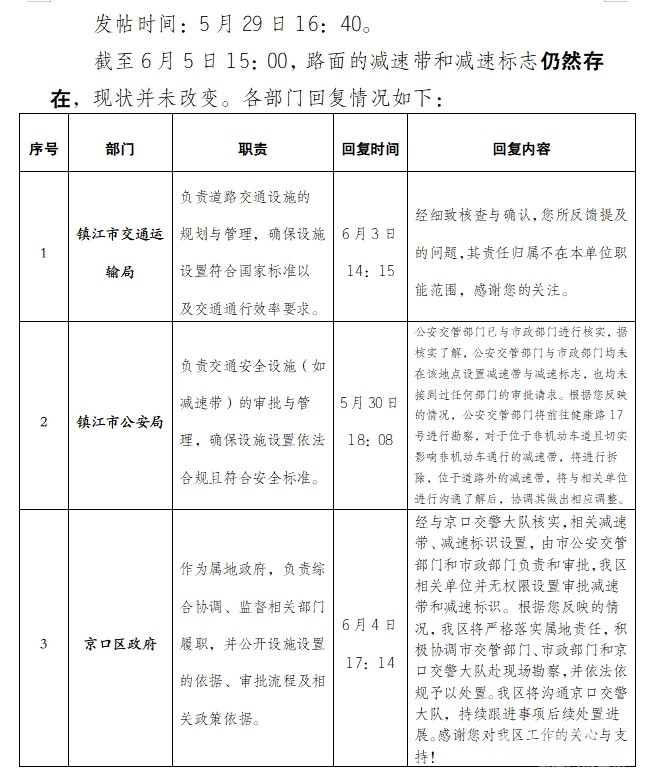 三个部门均已回复,回复速度、质量如下表。截至6月5日15:00,路面的减速带和减速标志仍然存在,现状并未改变。