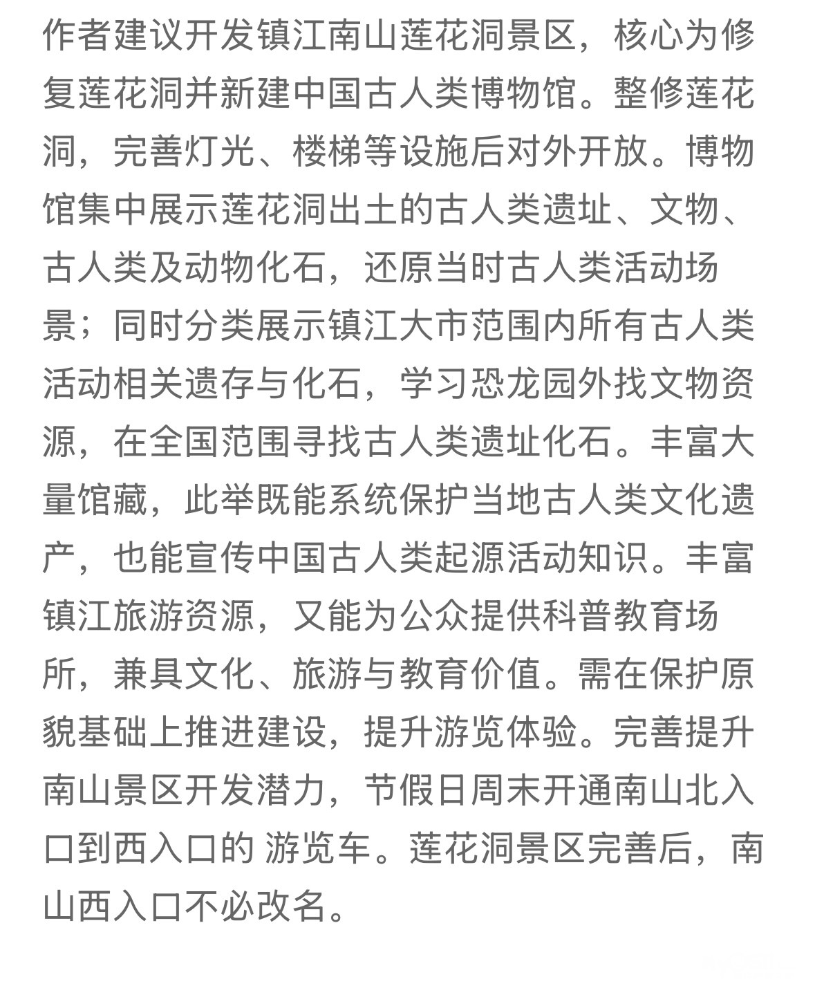 网友您好!感谢您对镇江文旅的关心!关于您提出的建议,市文广旅局答复如下:按照现行南山风景区总体规划,,莲花洞列入南山七个洞府地景景源之一,所属区域规划为莲花洞游览区,属南山核心保护区,生态红线区,以古人类遗址为主要特色,莲花洞遗址是文物保护单位,在减少对自然环境扰动的前提下,规划建设登山游步道,便于游客游览。关于新建古人类博物馆等一系列建议,将在综合考虑风景区、文物、生态保护等法规政策的基础上,结合南山详规编制实施,同其它相关建议意见一起纳入论证研究。