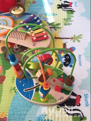 买的hape的,我当时是一个绕珠跟一份积木,他们家主要是做木质玩具,用的油漆是那种环保油漆,哪怕放嘴里都不要紧,而且棱角什么的打磨的很好。挺大一个,主要用来练习手指头的。除了珠子以外,还有一些动物造型这样。