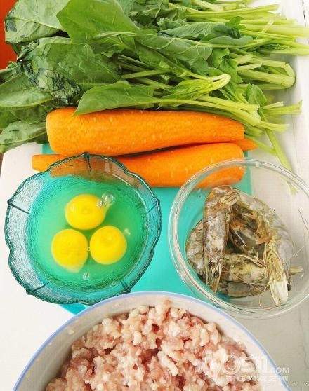 准备食材:菠菜 胡萝卜 肉馅 鸡蛋 虾 盐少量 葱少量
