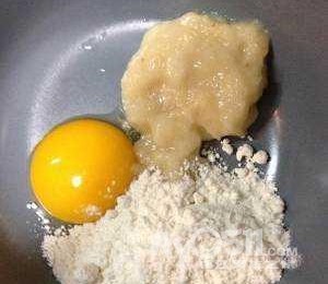 1. 香蕉压成泥,加入纯牛奶,少许盐/白糖,加入一颗鸡蛋搅拌均匀
