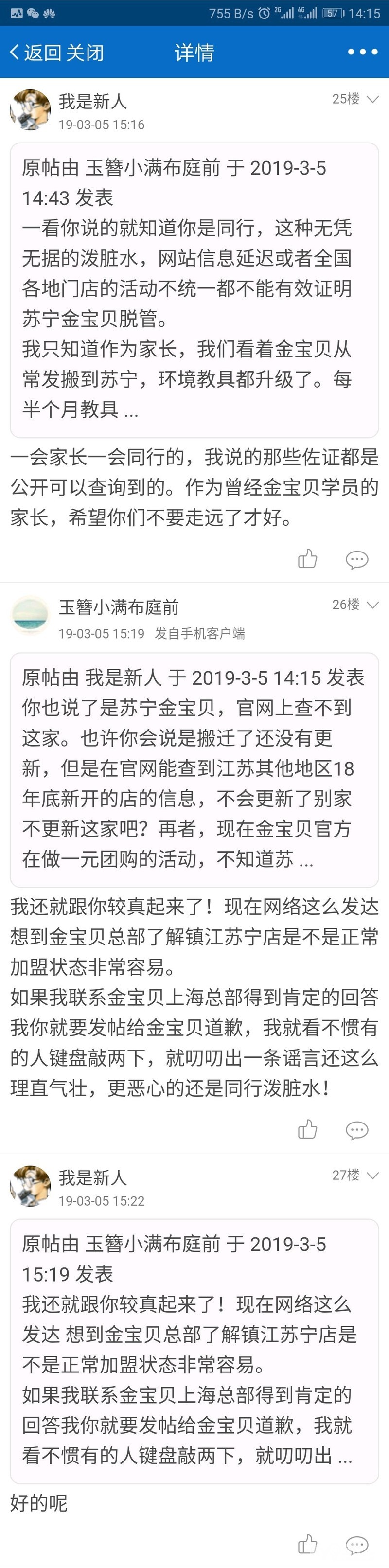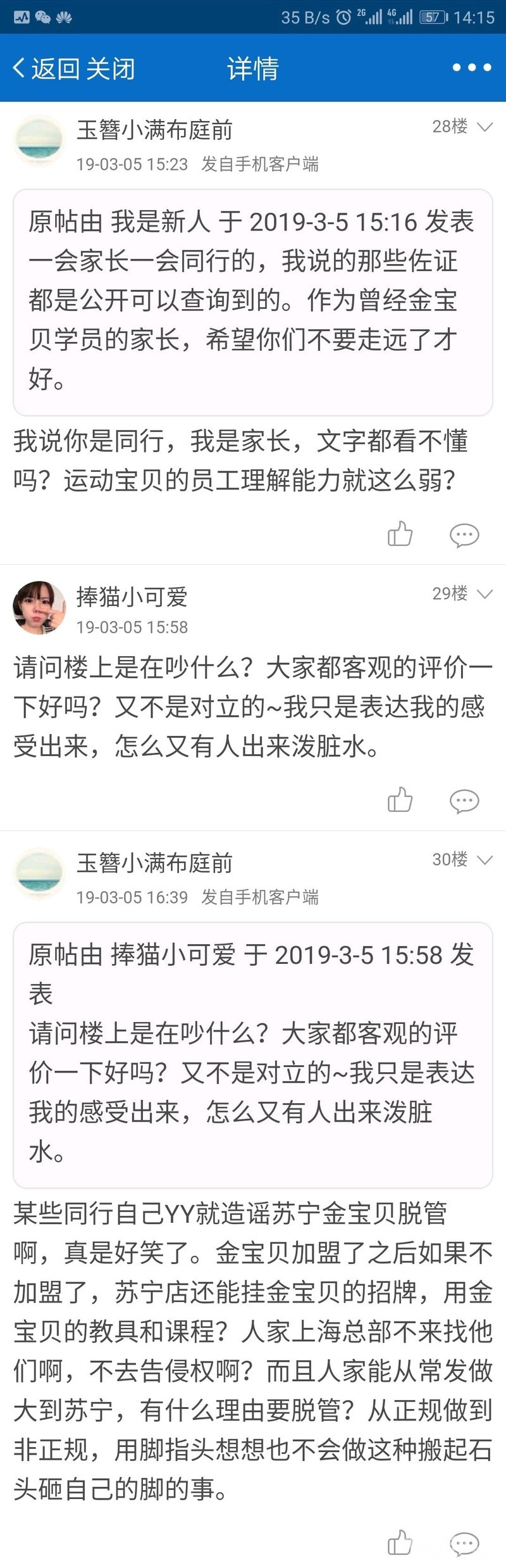 事情很简单,这位“我是新人”的网友在论坛里关于早教中心的讨论贴里抛出谣言:金X贝已经从总部脱管。