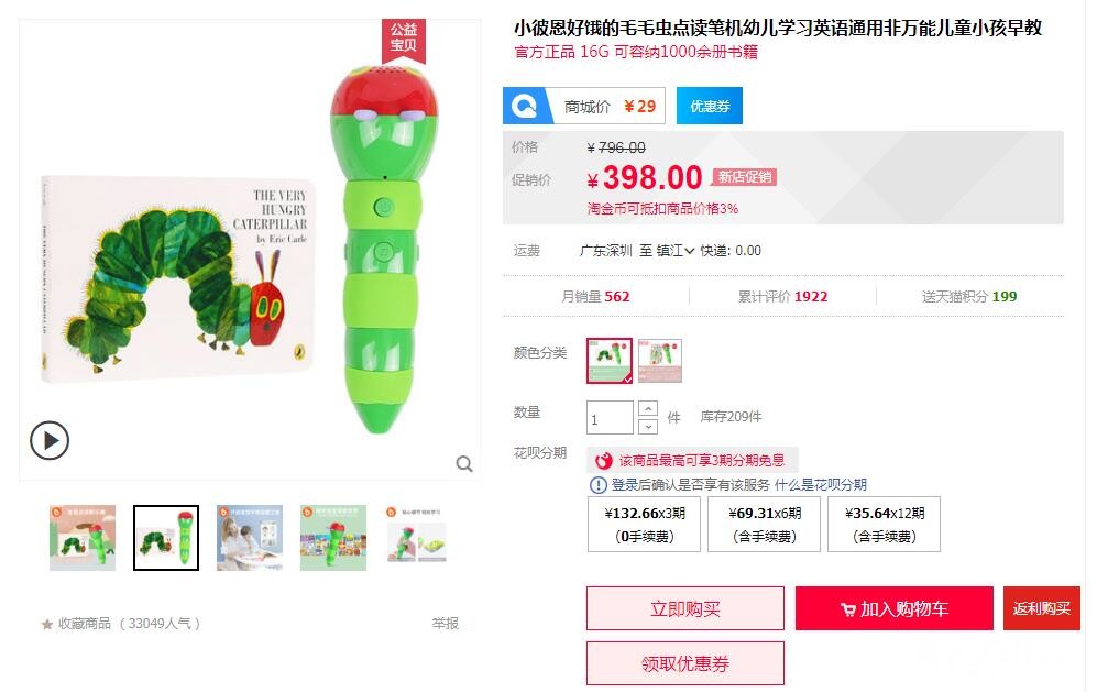 毛毛虫外形可爱,音质好,但是点读的都是原版书,书贵