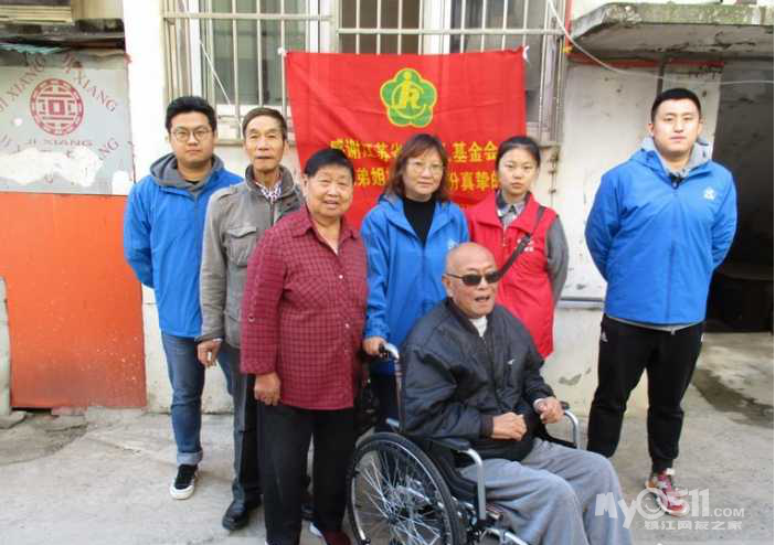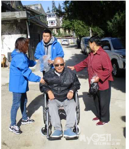 社区的工作人员和志愿者一起推着双腿残疾的蒋锡宝先生在太阳下悠闲地转悠并与他亲切交流。蒋老先生和家人一起对前来的工作人员表示衷心的感谢,脸上都洋溢着幸福的表情!