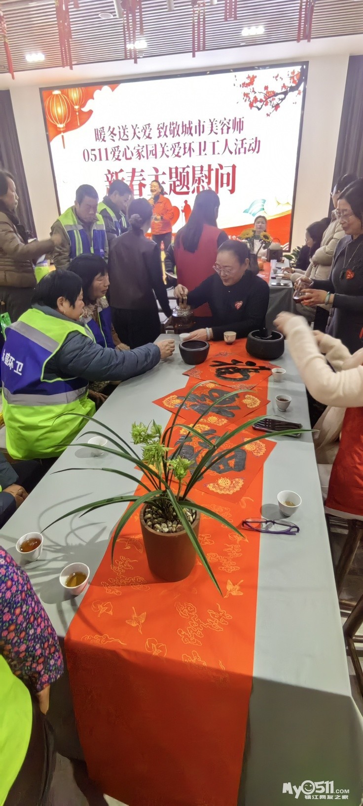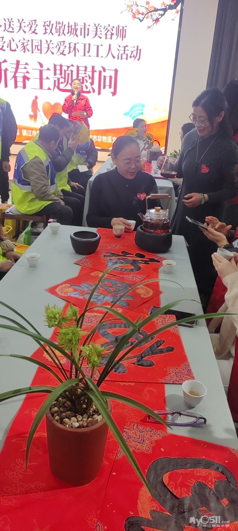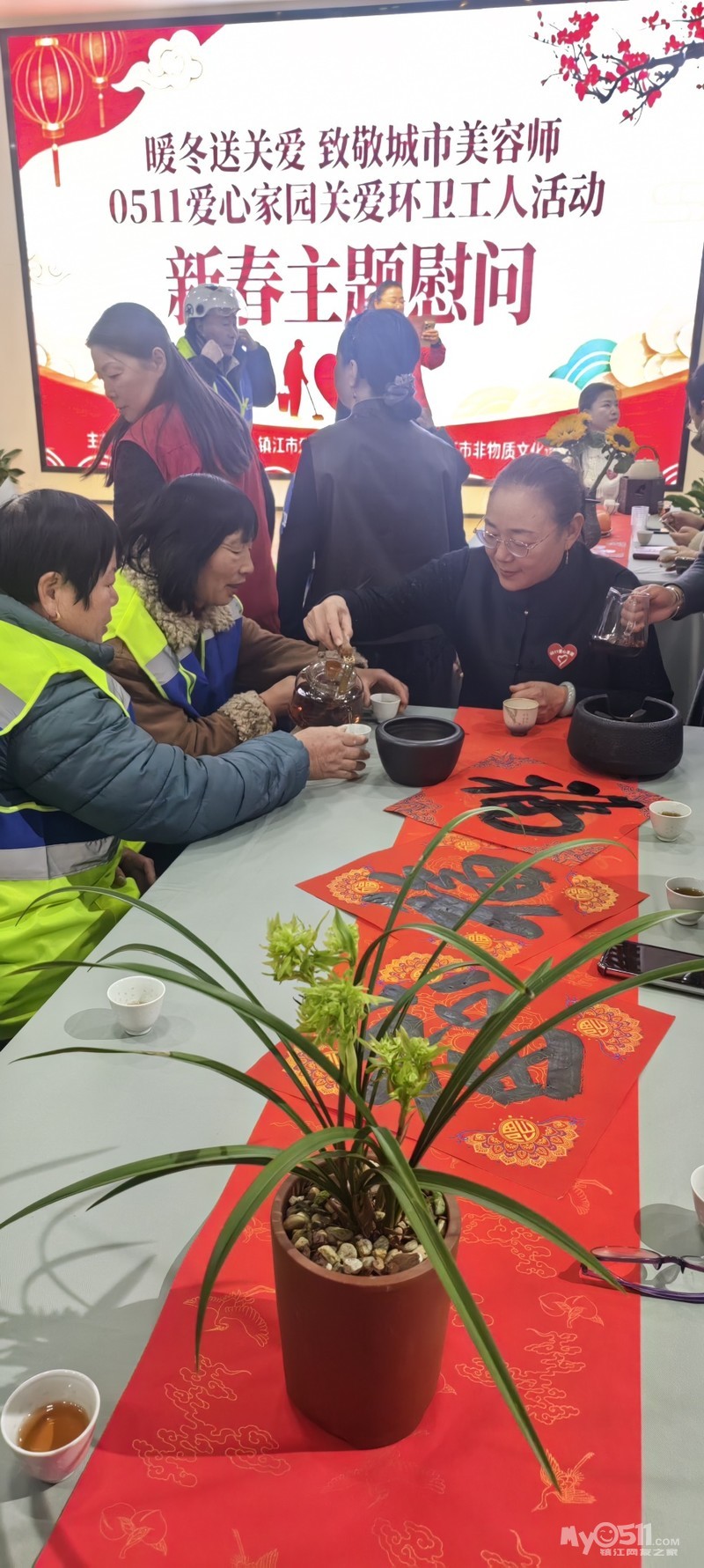 活动现场以红色、暖色调为主,场内新春茶席典雅温馨。公益茶事服务队的志愿者早早到场,精心布置茶席,为陆续入座的环卫工人奉上热茶,以茶暖身、以情暖心。