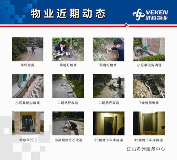 向大家介绍一下:维科物业公司在经过人员变动和内部整顿后,各项工作正在有序开展,一、二期装潢垃圾已能及时清理,有专人管理;车辆有专人管理;配有便民车接送老人和小孩;门岗管理正在加强;维修问题程序化,1、业主发现问题直接打88771116 ,2、前台接待受理后作好记录并立即通知维保员上门勘察、分析情况、分清责任;3、开出维修单通知具体单位修理;4、维修后前台接待电话回访并做好记录。